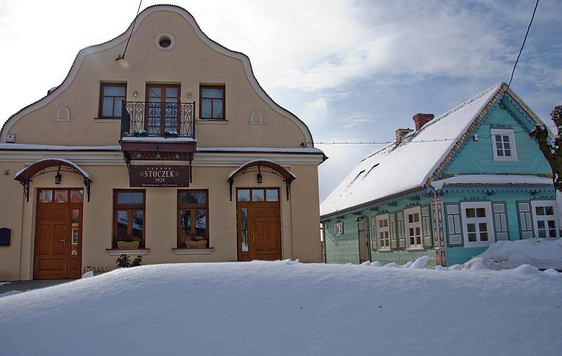Klimatyczna restauracja w starej żydowskiej kamienicy a tuż u jej boku drewniana białowieska chata z bali z okiennicami , gontem na dachu i bogato zdobiona na wzór tradycyjnych chatynek podlaskich.